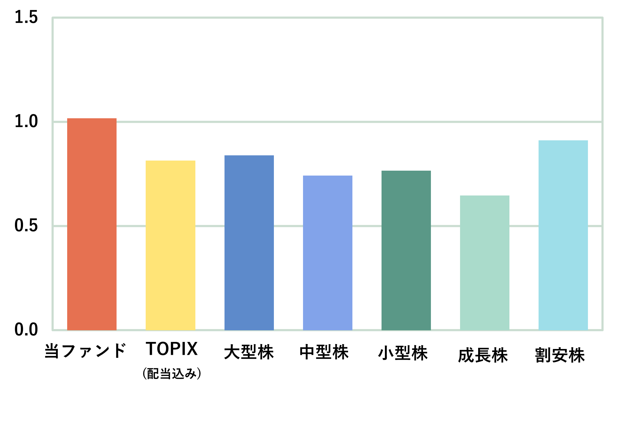 アクティブ元年・日本株ファンドのリスクは、TOPIX(配当込み)などに対してやや高めですが、より高いリターンを実現できたことによって、投資効率(年率リターン÷年率リスク:取ったリスクに対して、どのぐらいのリターンをあげてきたかを表す。数値が大きいほど投資効率が高いといえる)は、TOPIX(配当込み)に加え、規模別やスタイル別の指数に対しても高くなっていますので、効率よく運用できていることを示しています。アクティブ運用の価値をここまではしっかりと示せていると思います。